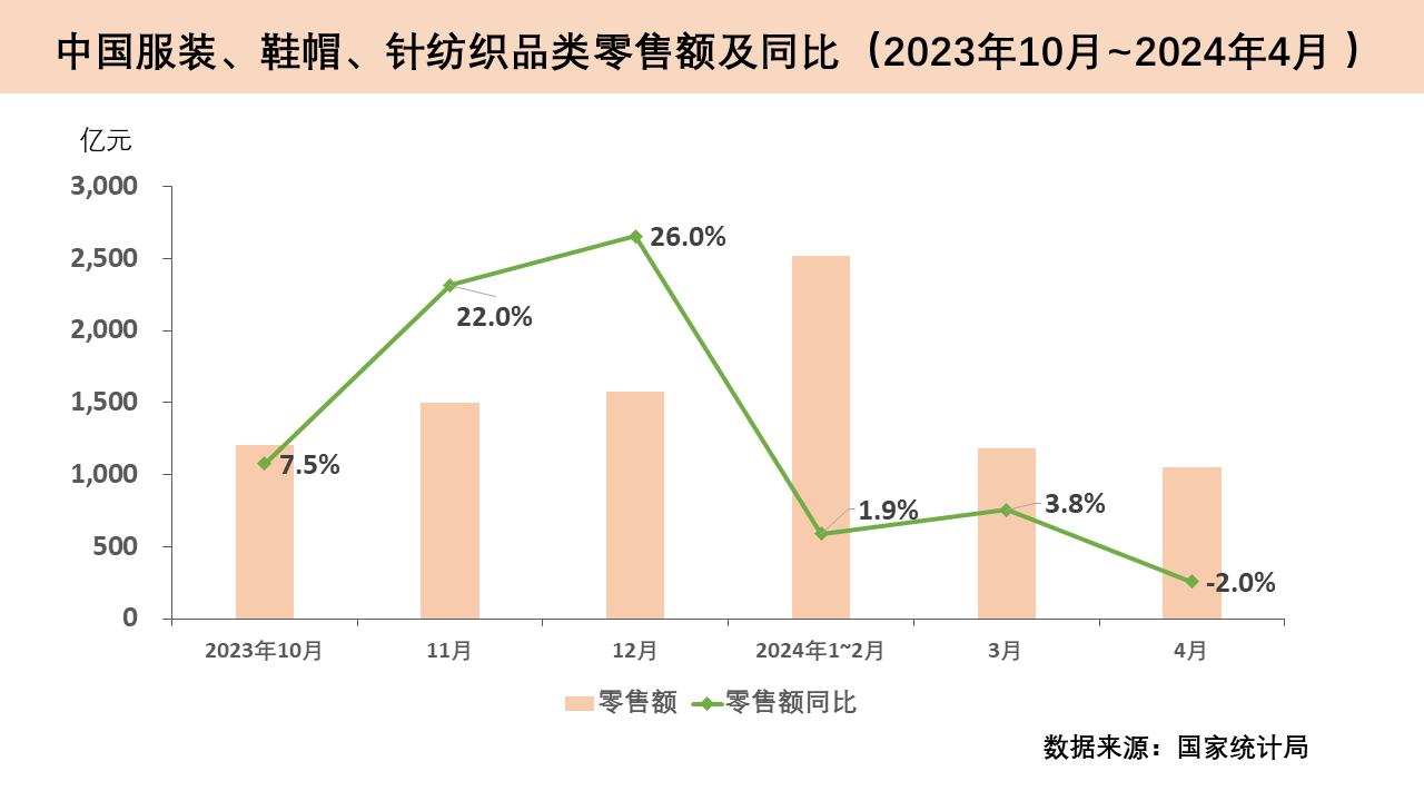 我國內需平穩增長。2024年一季度,我國GDP同比增長5.3%,社會消費品零售總額同比增長4.7%,經濟運行延續回升向好態勢。服裝零售潛力穩步釋放,乐动买球平台 服裝消費實現平穩增長。1至4月,我國限額以上單位服裝鞋帽、針乐动买球平台 類商品零售額達4717億元,同比增長1.5%,但4月當月限額以上單位服裝類商品零售額同比下降2%。直播帶貨等電商新模式對線上消費增長的拉動作用明顯,1至4月全國網上穿類商品零售額同比增長10.5%,增速較上年同期放緩3個百分點。