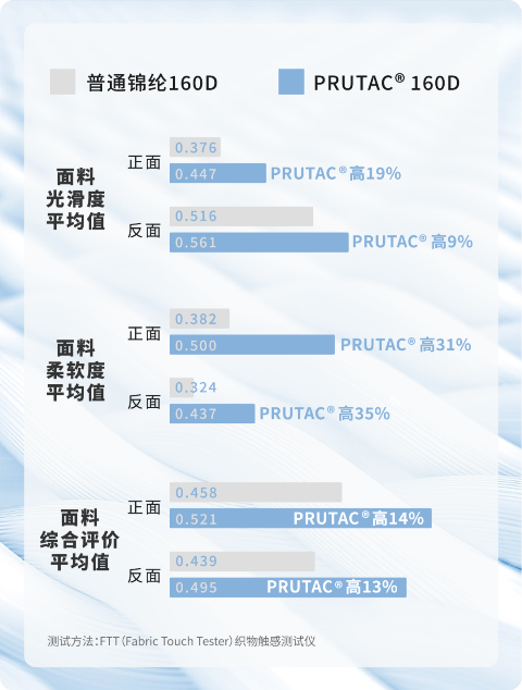 根據FZ/T 01166-2022《乐动买球平台 織物觸感檢測與評價方法:多指標集成法》測試標準,錦綸66 PRUTAC?織物光滑度和柔軟度明顯優於普通錦綸,整體觸感更加舒適。