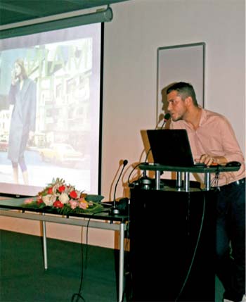 在講座上,Massimo Carminati結合女性氣質從麵料色彩、材質、廓型這三個方麵分析了2015/16 年秋冬女裝流行趨勢,同時介紹了Chanel、LV、三宅一生等品牌的女裝設計,並溯源到這些設計背後的文化曆史背景。