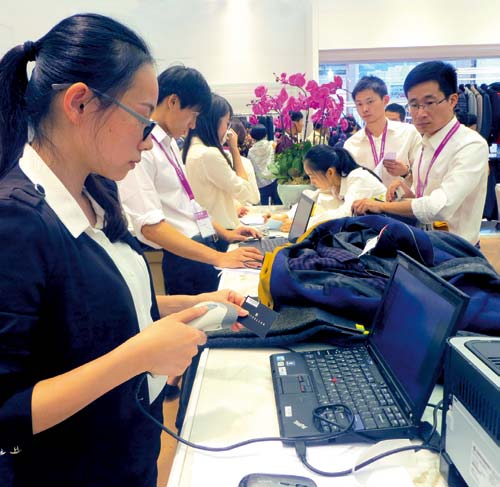 2、在江陰龍陽紡織有限公司展位,記者看到,觀眾紛紛拿著自己心儀的麵料排隊交給工作人員。原來,龍陽紡織的每一款參展麵料都設有二維碼,觀眾隻要將看中的麵料交給工作人員掃描,同時錄入買家地址,公司總部就會即時得到相關信息並組織發樣品,效率大大提高。