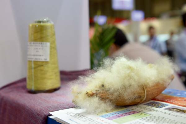 6、新型天然功能性纖維受到關注,木棉纖維被喻為樹上"羊絨",擁有天然抑菌、天然驅蟎、天然中空三大功能,木棉是木本植物的果實纖維,是一種綠色生態、環境友好、低碳環保的植物纖維。圖為一家國內企業展示的木棉纖維樣本。
