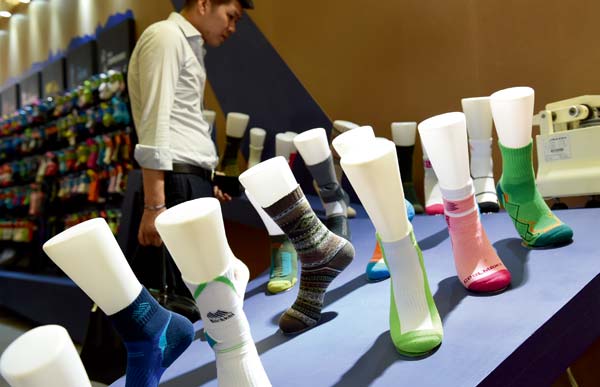 7、一家企業展出的戶外功能性襪子。這裏的每一雙襪子都具備最佳舒適性以及透氣快幹、超強耐磨、抗菌除臭的功能。