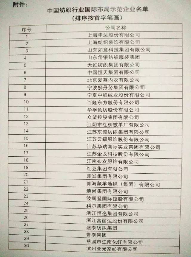 會上,中國紡織工業聯合會原副會長許坤元,副會長兼秘書長高勇,副會長楊紀朝,顧問張延愷,會長助理、中國國際貿促會紡織行業分會常務副會長徐迎新對“中國紡織行業國際布局示範企業”進行了表彰,具體名單如下: