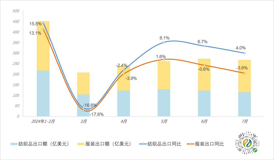 今年以來,發達國家市場需求保持平穩,為我國紡織行業出口競爭力釋放提供較好條件,乐动买球平台 服裝出口總體實現超預期增長。受到美元延遲降息、通脹下行放緩等因素影響,下半年國際市場存在下行壓力,7月當月我國乐动买球平台 服裝出口額同比已有所下滑,年底前,行業出口仍麵臨挑戰。
