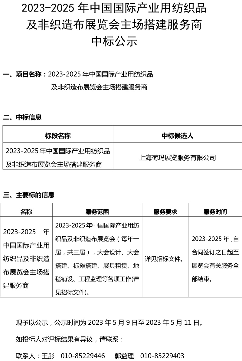 您現在的位置是:首頁 > 最新公告 2023-2025年中國國際產業用乐动买球平台 及非織造布展覽會主場搭建服務商中標公示 發布日期:2023-05-09 字體: 【小】 【中】 【大】 分享: 熱門文章: 六部門部署2023年促進跨境貿易便利化專項行動 [2023-05-09] @外貿企業,這些政策措施幫你穩訂單拓市場! [2023-05-09] intertextile武漢站 | 江城新坐標 展商甄選第二... [2023-05-09] 中央越來越重視現代化產業體係,有何深意? [2023-05-09] 中央最新定調,5000字解讀 [2023-05-09] 展會直通車